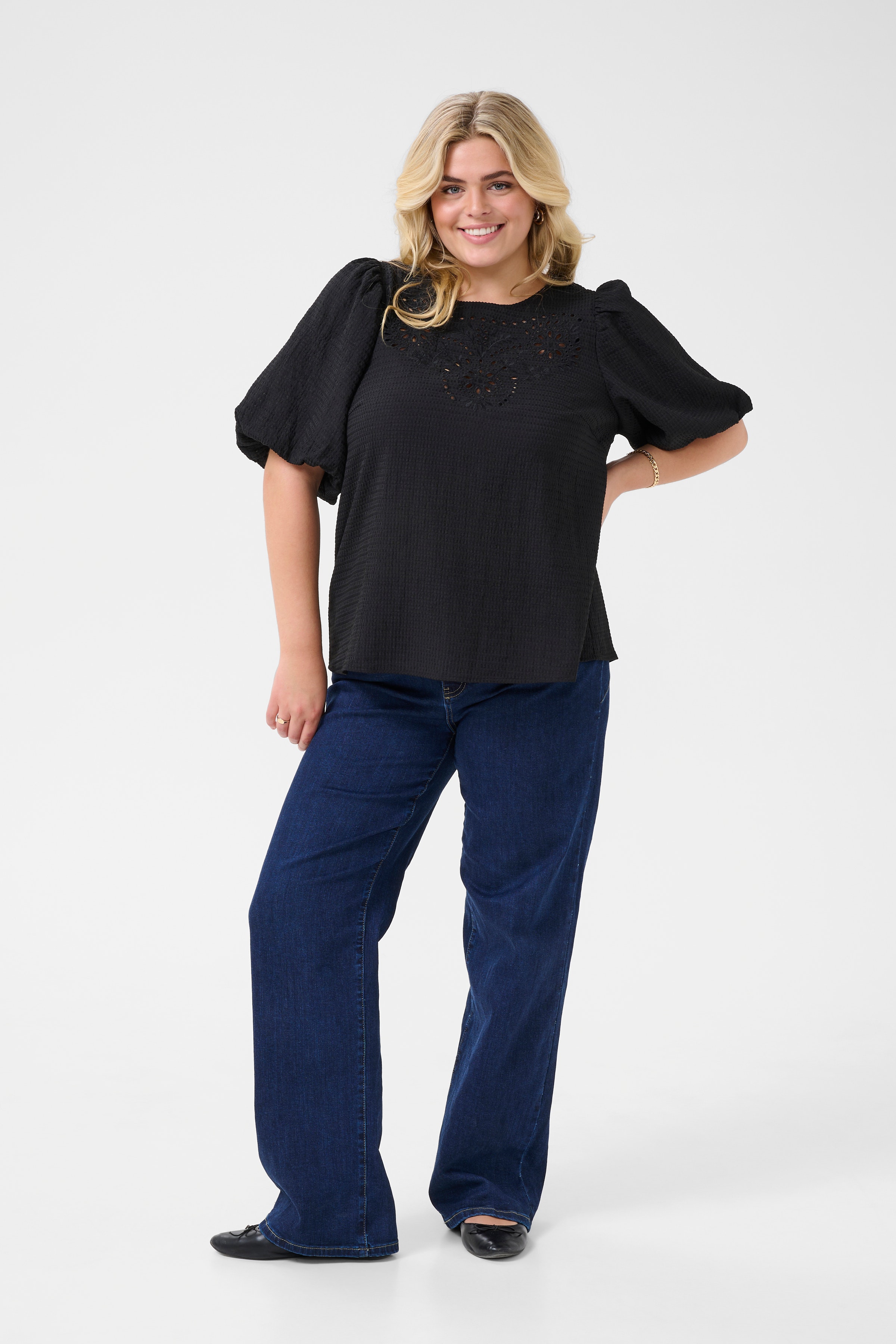 Denne bluse til damer har en løs pasform, elegant rund halsudskæring og voluminøse pufærmer, der sikrer et moderne look. Fin brodering giver blusen et raffineret touch, mens det lette og åndbare materiale gør den komfortabel til hele dagen. Perfekt til både hverdag og arbejde.