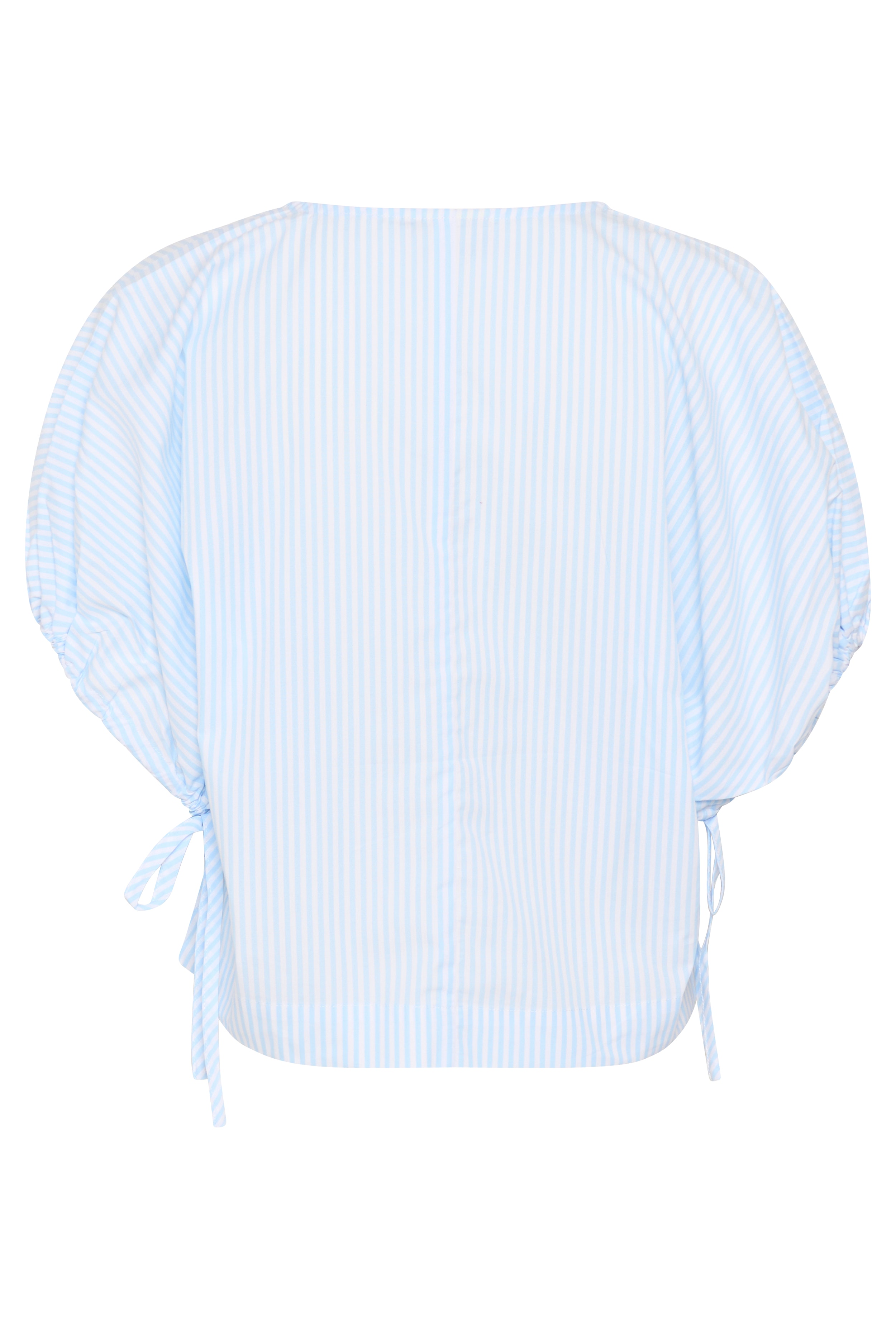 Boxy geschnittene Streifenbluse mit V-Ausschnitt, kurzen, weiten Ärmeln und Bindebändern. Verkürzte Länge und modernes, klares Design.