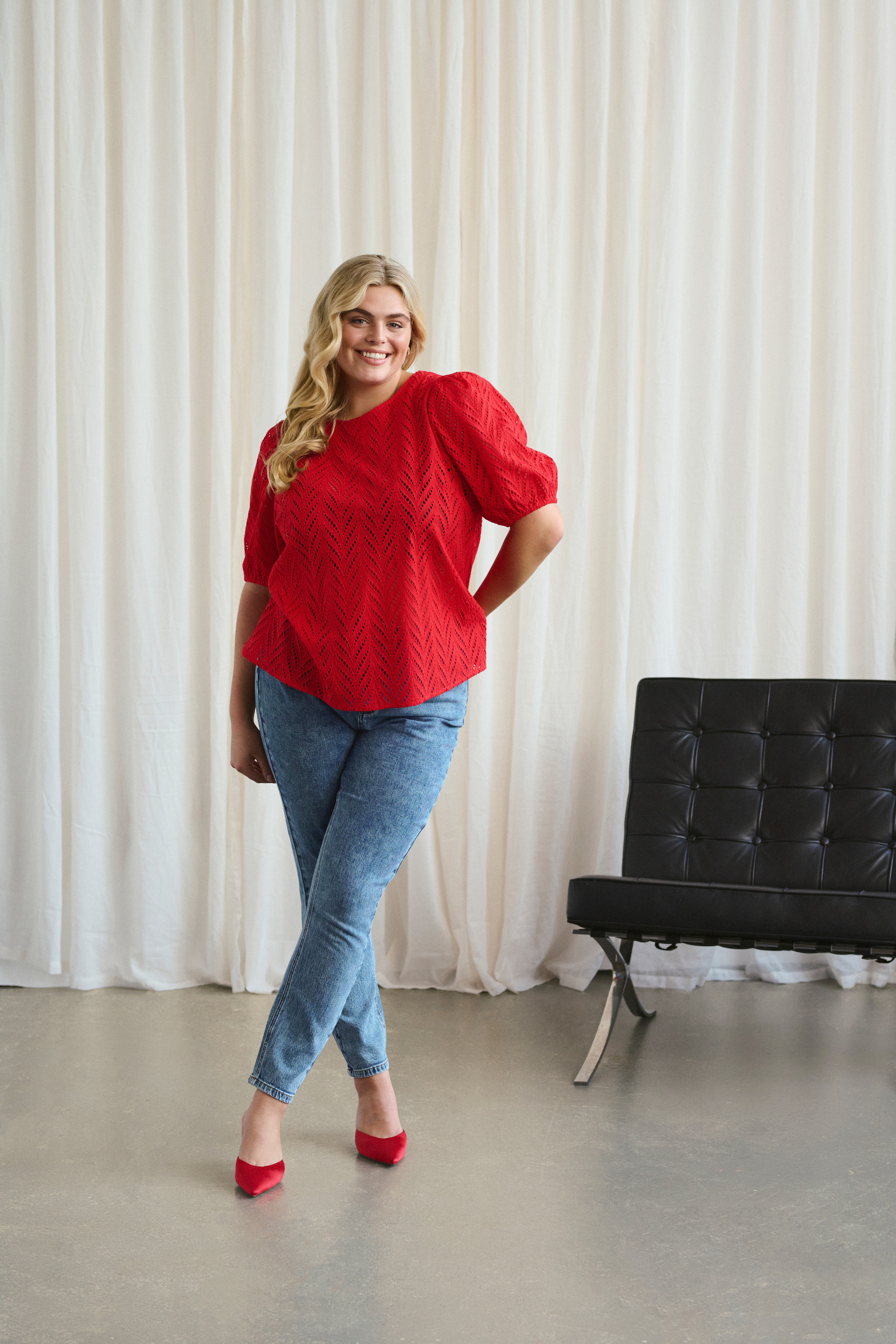 Diese Damenbluse mit kurzen Puffärmeln und lockerer Passform besticht durch ein strukturiertes Stickdesign. Der Rundhalsausschnitt sorgt für klassische Vielseitigkeit im Alltag und zu besonderen Anlässen.