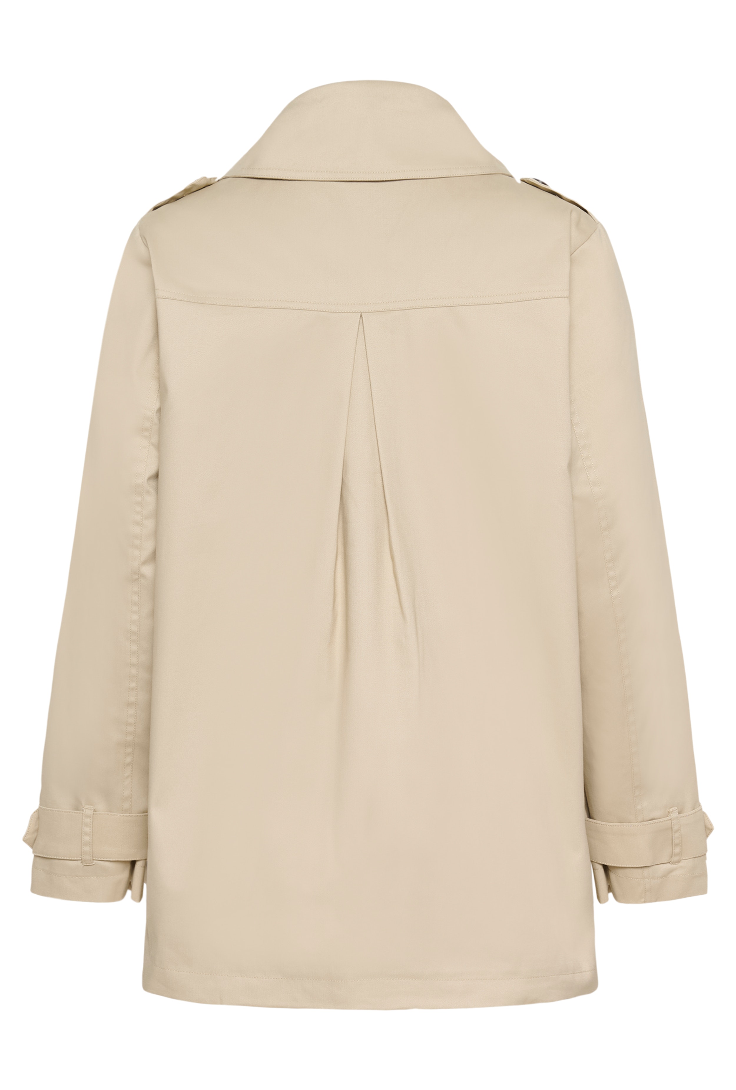 Kurze Jacke im Trench-Stil mit Knopfverschluss, Reverskragen und Schulterriegeln. Mit paspelierten Taschen und verstellbaren Ärmelabschlüssen mit Riegel. Das Model ist 172 cm groß und trägt Größe S/44.