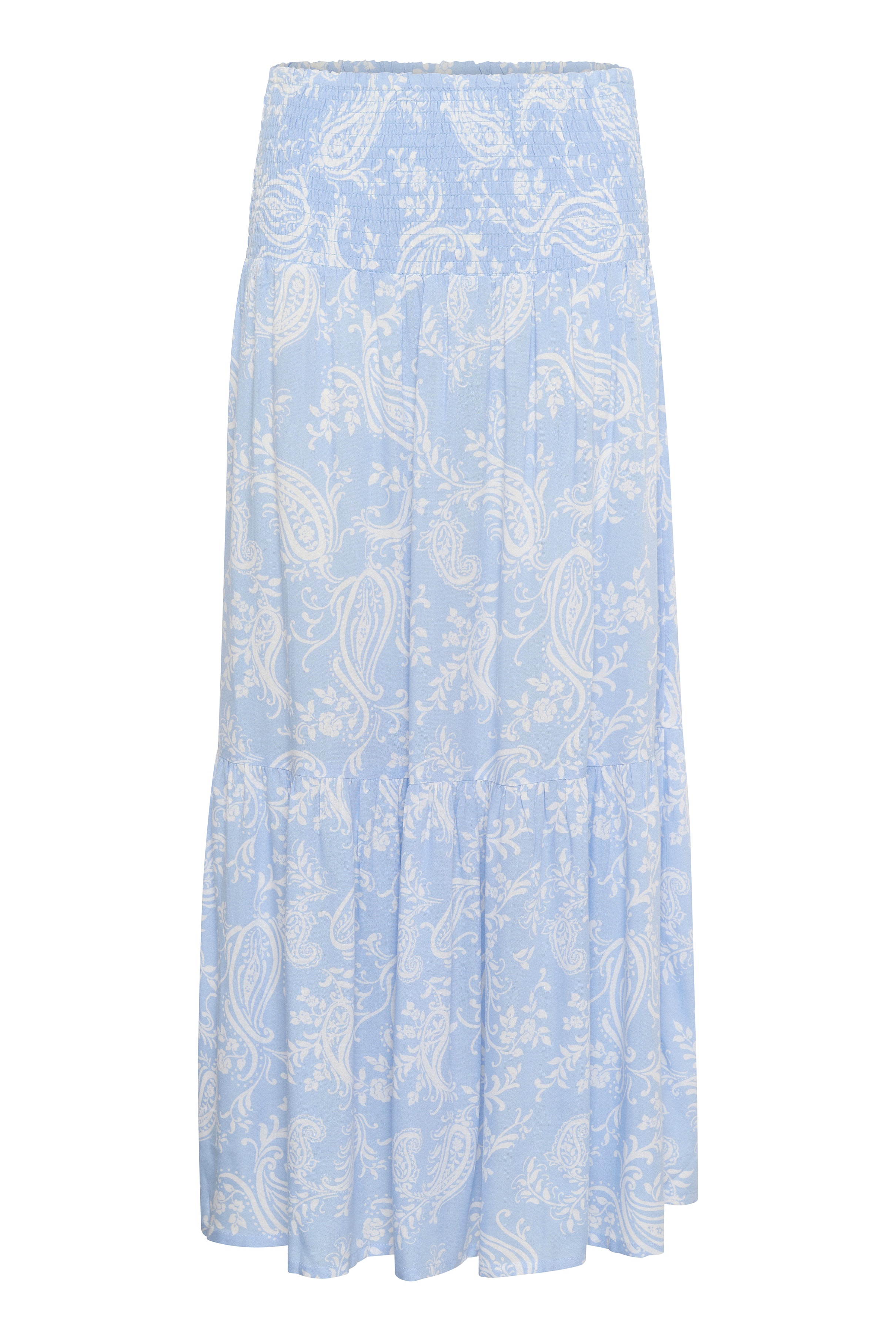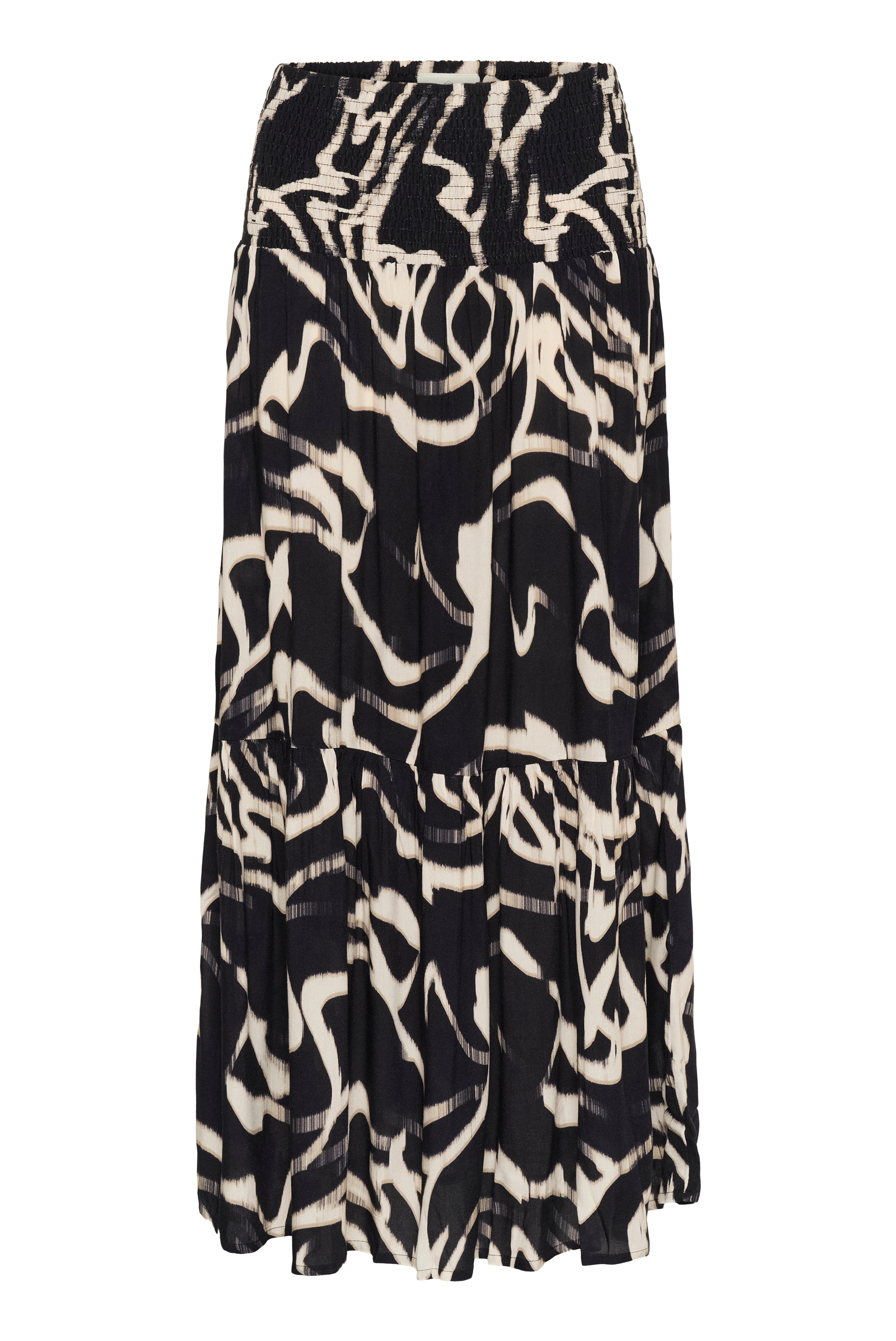 Maxi skirt featuring an all-over abstract pattern, smocked high waistband, and a softly flowing, tiered silhouette. Defined by its full-length fit and gathered detailing for a contemporary edge.