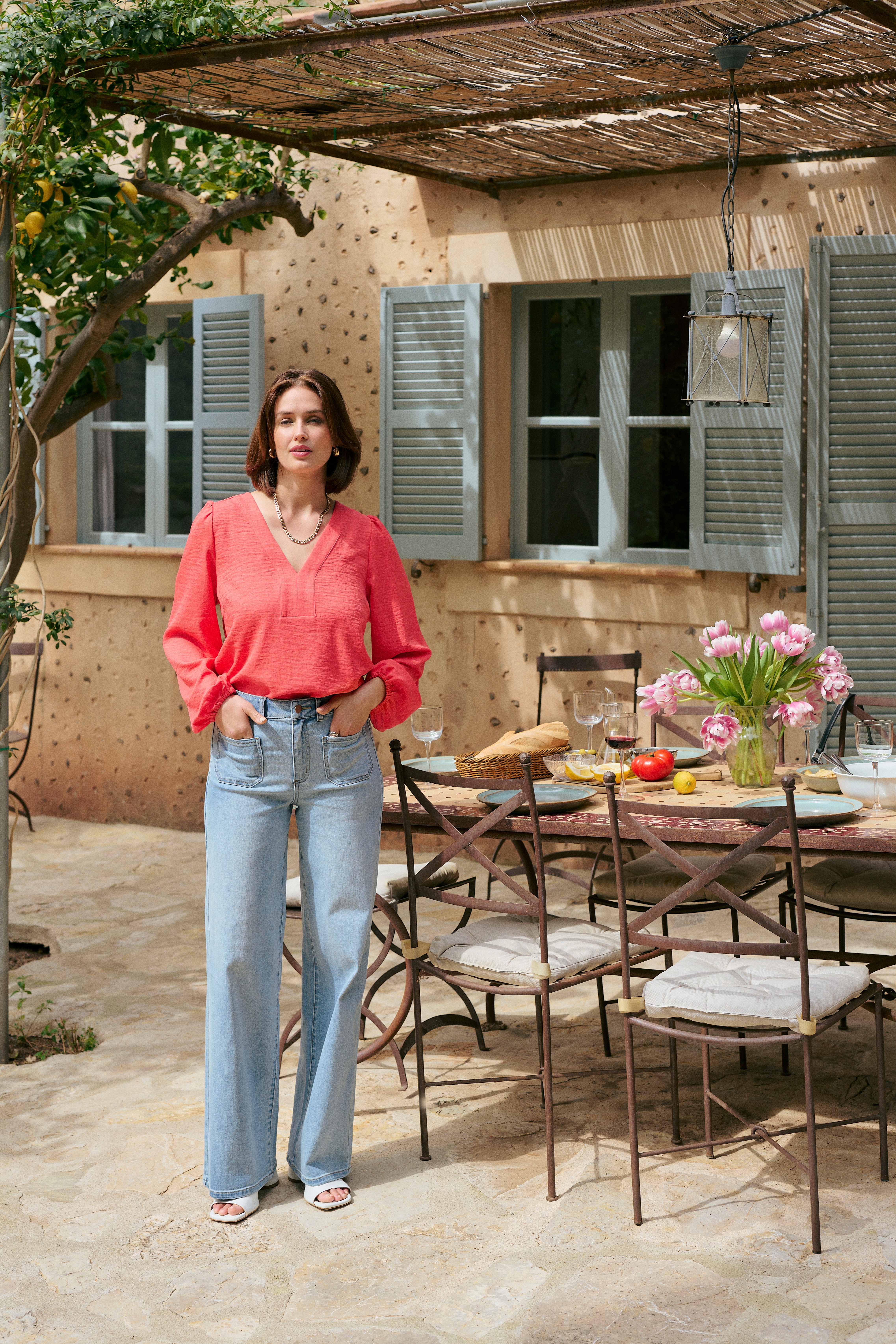 Long sleeve V-neck blouse with a subtle textured finish, straight fit and elasticated cuffs. Effortlessly modern silhouette designed for an easy, polished look.
