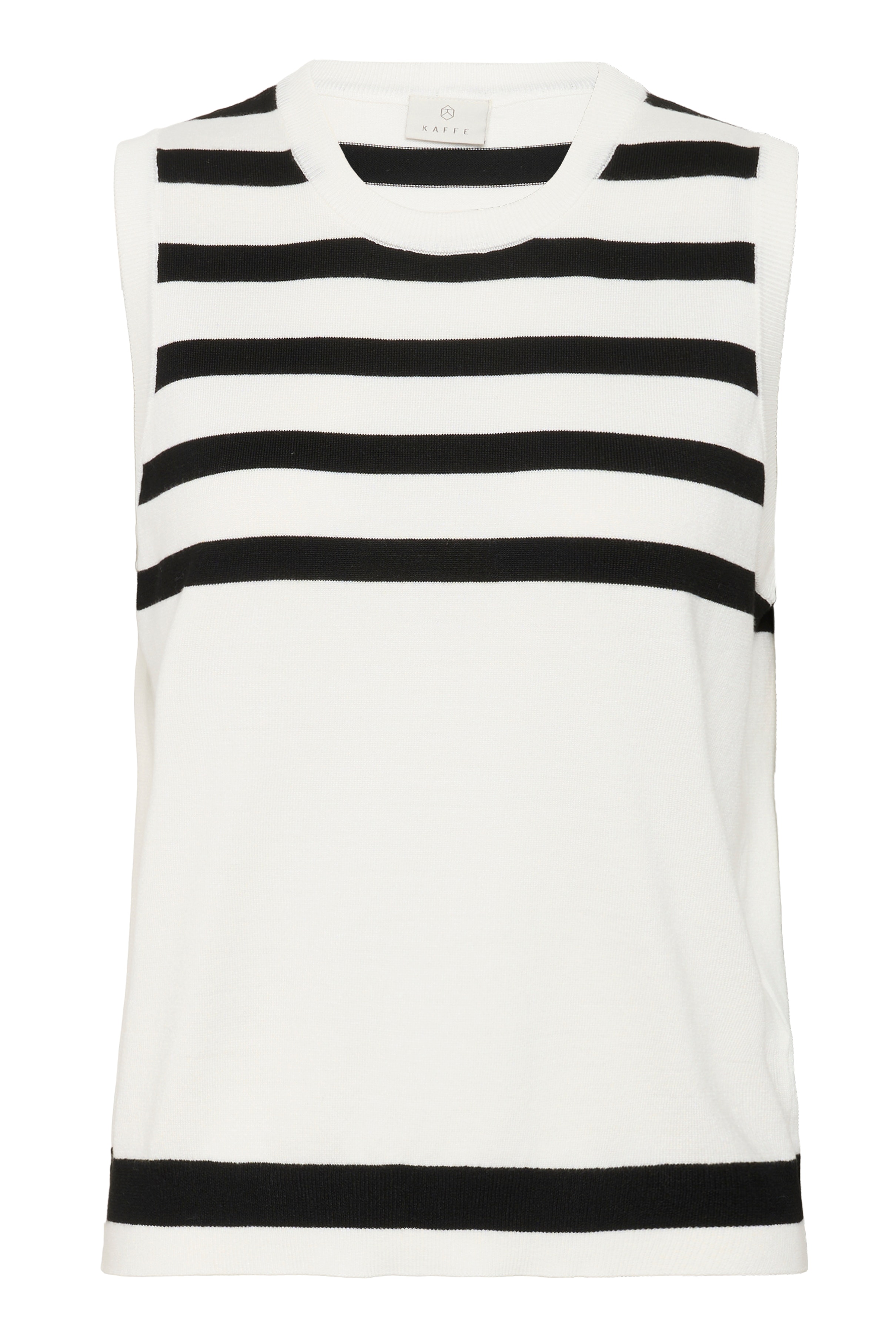 Ärmlös stickad topp med raka ränder, ribbad rund hals och mjuk yta. Slät vid ärmöppningen och bekväm avslutning nedtill.