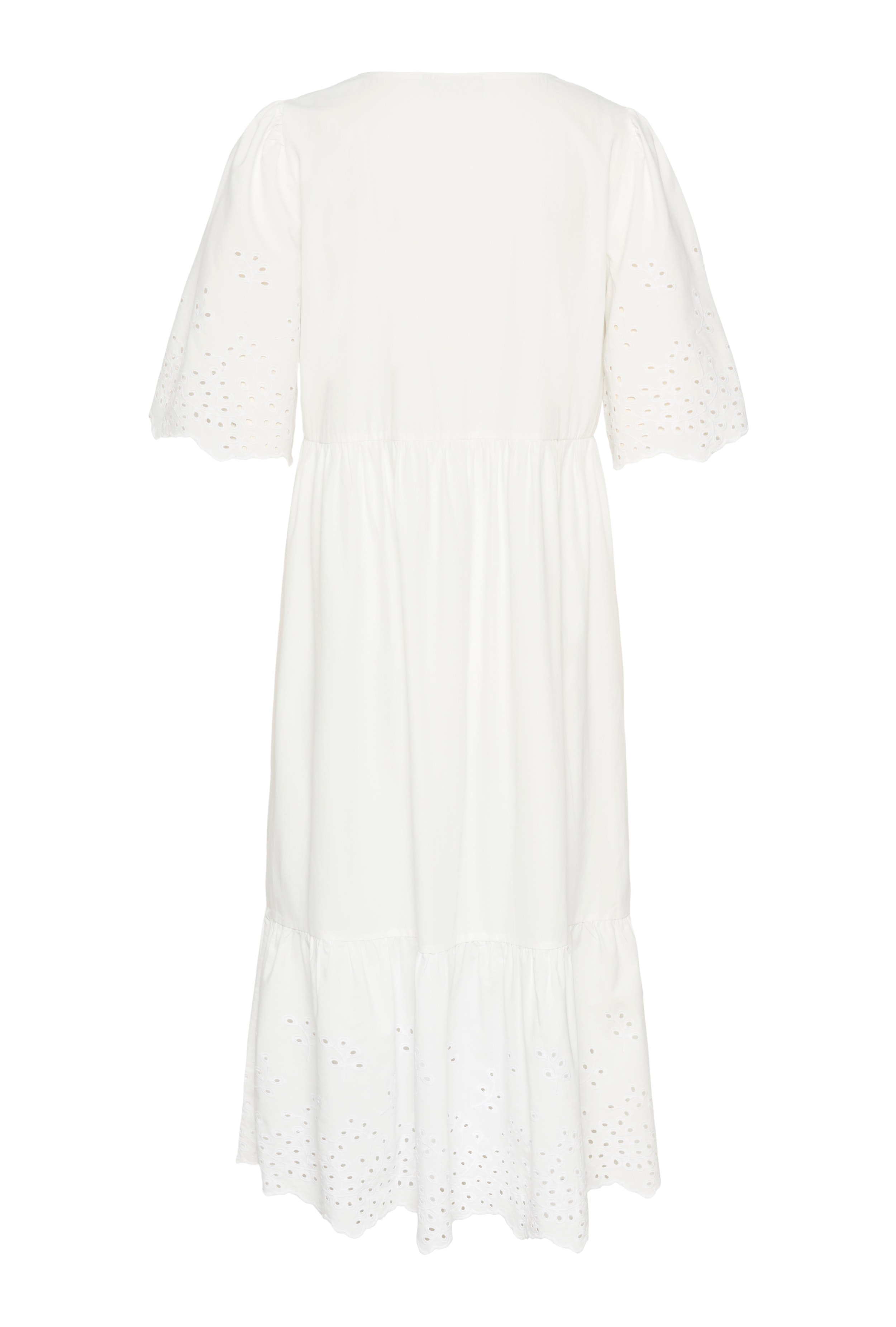 Midiklänning med V-ringning, ledig silhuett och vida ärmar i armbågslängd med dekorativa håldetaljer på både ärmar och nederkant.